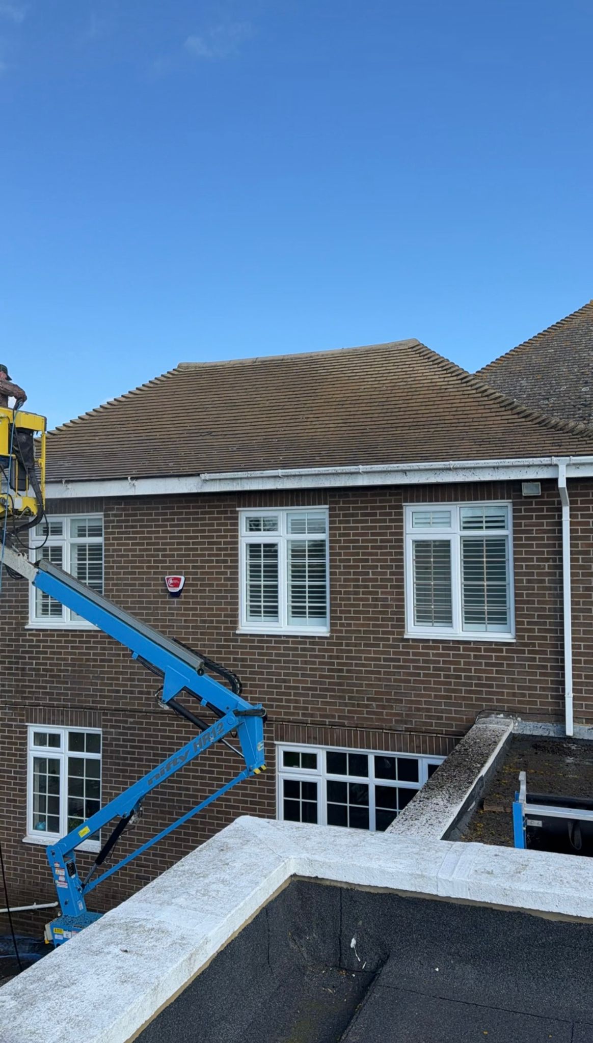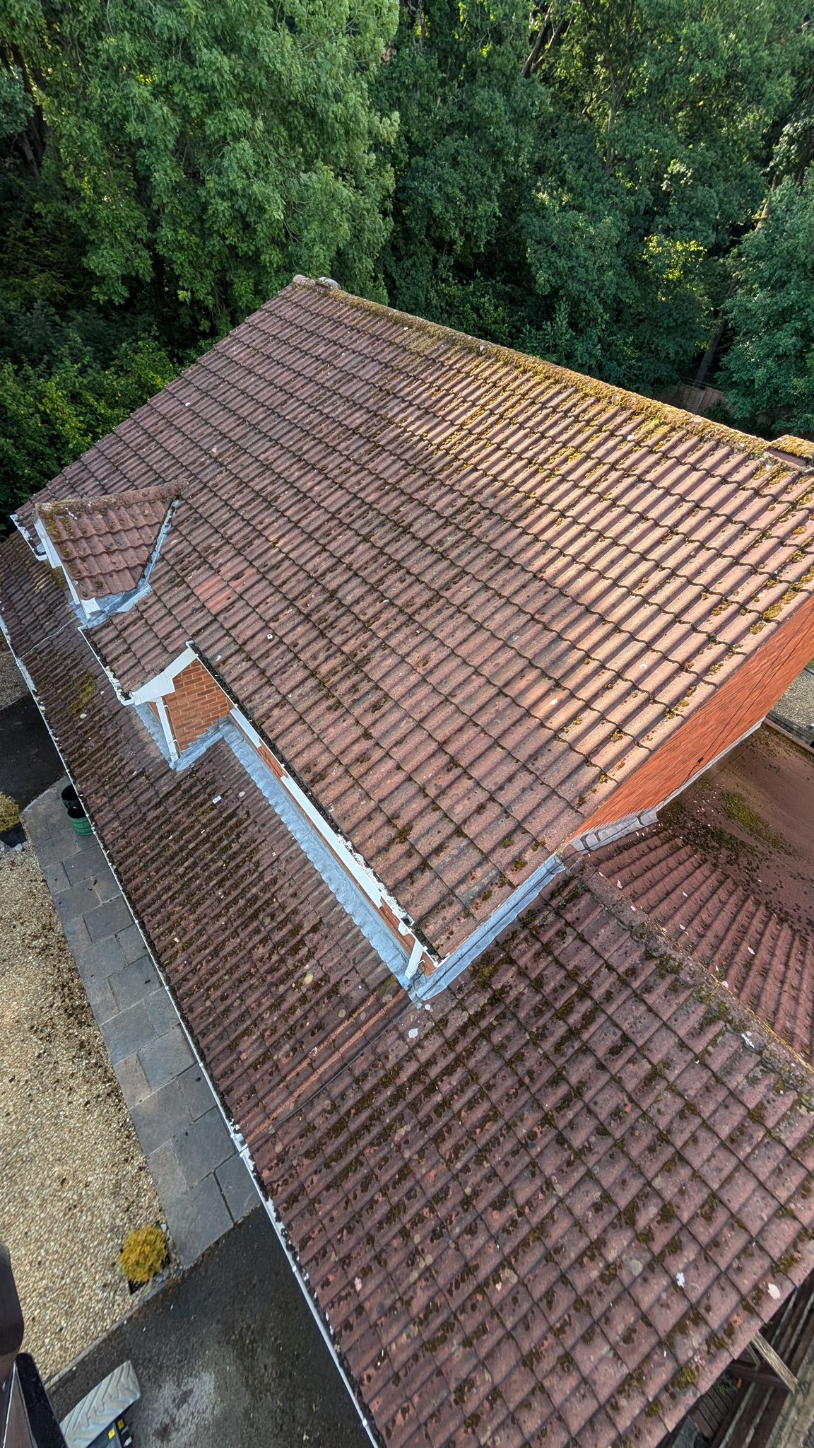Extensive lichen and moss coverage removed from a large multi-section roof using specialist equipment. Full biocide protection applied on completion.